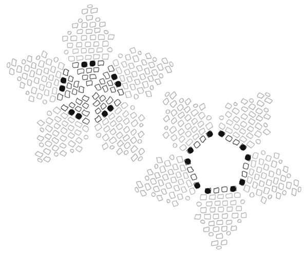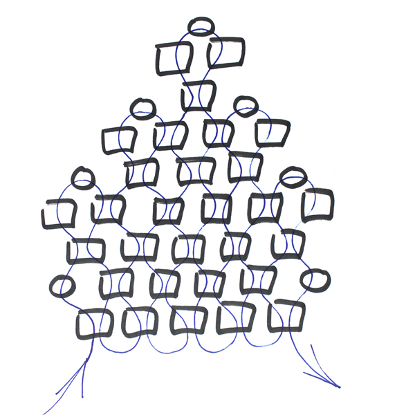 Теперь нам их нужно сшить вместе. Т.к. этот процесс довольно сложно снимать, я нарисовала схему. На схеме обозначены бисерины которые нам нужно сшить вместе.