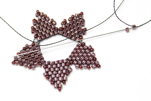В следующем ряду пришиваем по 3 бисерины к каждому лепестку, всего бисерин будет 15.