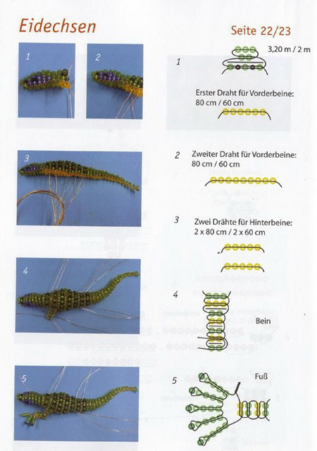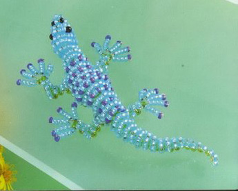 Плетется эта ящерица из бисера параллельным объемным плетением, схема простая. Чтобы игрушка получилась красивой обязательно подберите яркие, красивые цвета и ровный бисер, желательно чешский. Бисерины должны быть мелкие, №10 чешского бисера. Ящерица из крупного бисера просто не будет держаться на ножках. Плетется ящерица на проволоке, для набивки можно использовать целлофан или мятую бумагу.