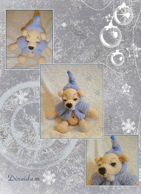На сайте Марины в очередном он-лайне связали сонного мишку.Толстого,теплого,уютного, очень обнимательного. 38 сантиметров роста в моем джентльмене) Сидит у изголовья кровати. И, просыпаясь, я смотрю на него с улыбкой)