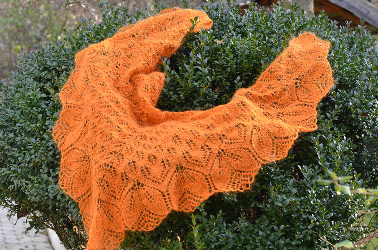 Моя первая и, надеюсь, не последняя шаль Харуни была выполнена из пряжи Angora Lux от Filati Fantazia(50% ангора-мохер, 50% акрил; 250м/50g). Ушло ровно 2 мотка - 100g. Получившийся размер шали (после обработки): 69см в высоту и 146см - размах крыльев.