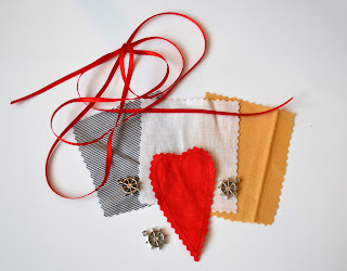 Использованные в работе материалы: бязь для тела, ткань в полосочку для верхней части платья-матросски, белая бязь для юбочки, бязь красного цвета для кораблика и сердечек