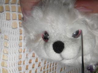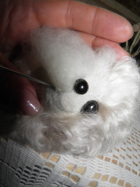 Теперь веки.Это сложно описать...я накрываю глаз полностью кусочком шерсти,пришватываю у начала века,и там где оно заканчивается,приваливаю шерсть вдоль всего глаза,а потом как бы открываю его,вводя иголку вдоль глазика