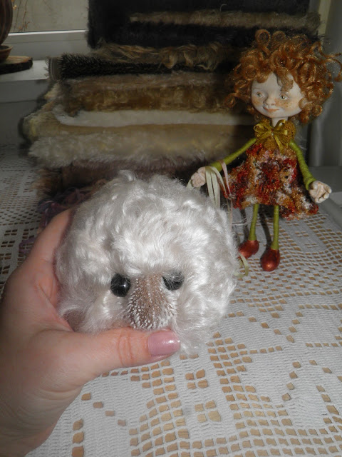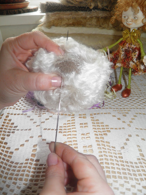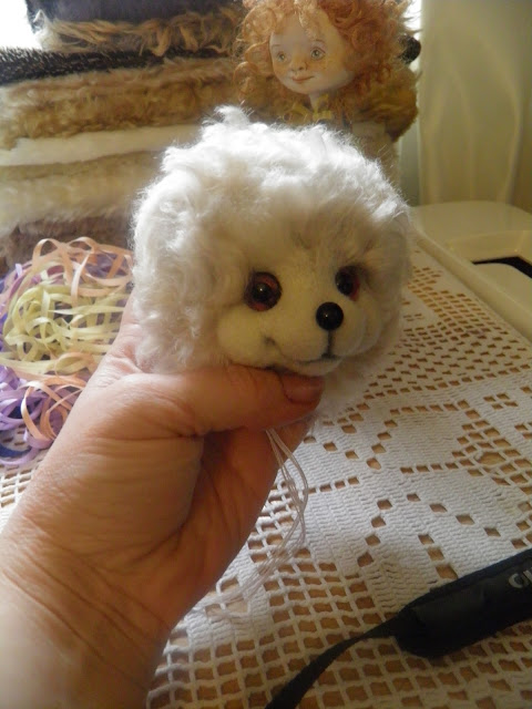 Берем немного кордачеса,и прилаживаем его к подбородку-начинаем приваливать,накрывая шерстью всю бульбу носика