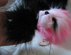 Вставьте ваши глаза, как вы это обычно делаете. Я делаю это, делая крошечный разрез в меха в центре глазницы (просто убедитесь, что Вы не отрезать нитки Вы использовали, чтобы утопить розетки в первую очередь. Еще одна подсказка при настройке глаза на искусственный мех медведей отрезать только один поток в поддержку. Искусственный мех обычно вяжут покрытием, и с натяжением помещается на нем, так плотно набили - он будет распутывать очень большие, если вы слишком сильно урезали).
