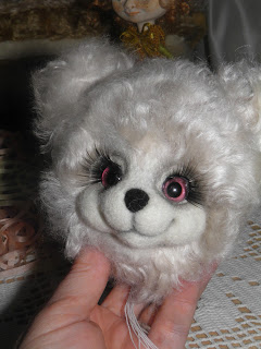 Теперь веки.Это сложно описать...я накрываю глаз полностью кусочком шерсти,пришватываю у начала века,и там где оно заканчивается,приваливаю шерсть вдоль всего глаза,а потом как бы открываю его,вводя иголку вдоль глазика