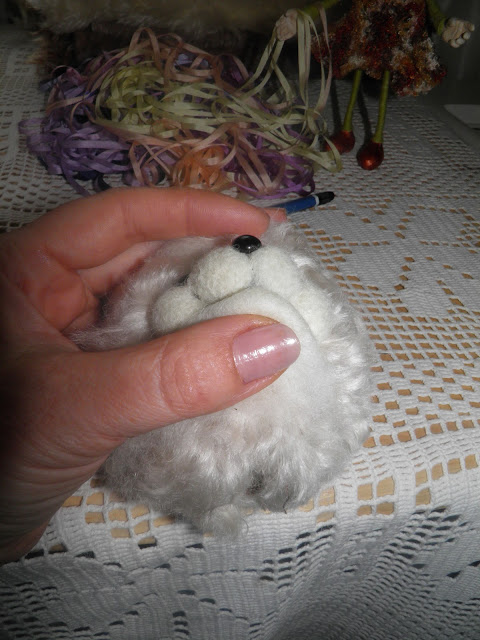 Берем немного кордачеса,и прилаживаем его к подбородку-начинаем приваливать,накрывая шерстью всю бульбу носика