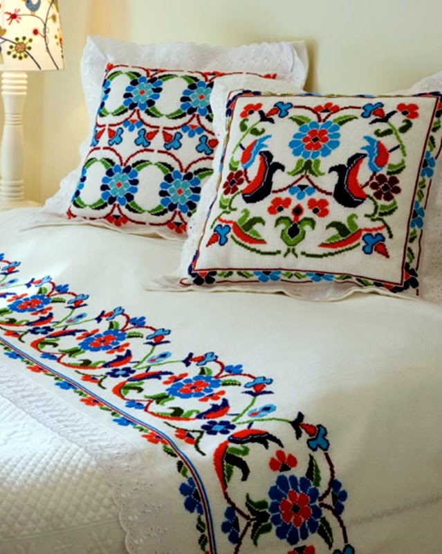 Предметы вышитые в этом стиле производились в небольших семейных мастерских. Традиционно это была обивка для мягкой мебели, подушки и покрывала выполненные геометрическим рисунком "зиг-заг" или ромбами с использованием тонких шерстяных ниток.