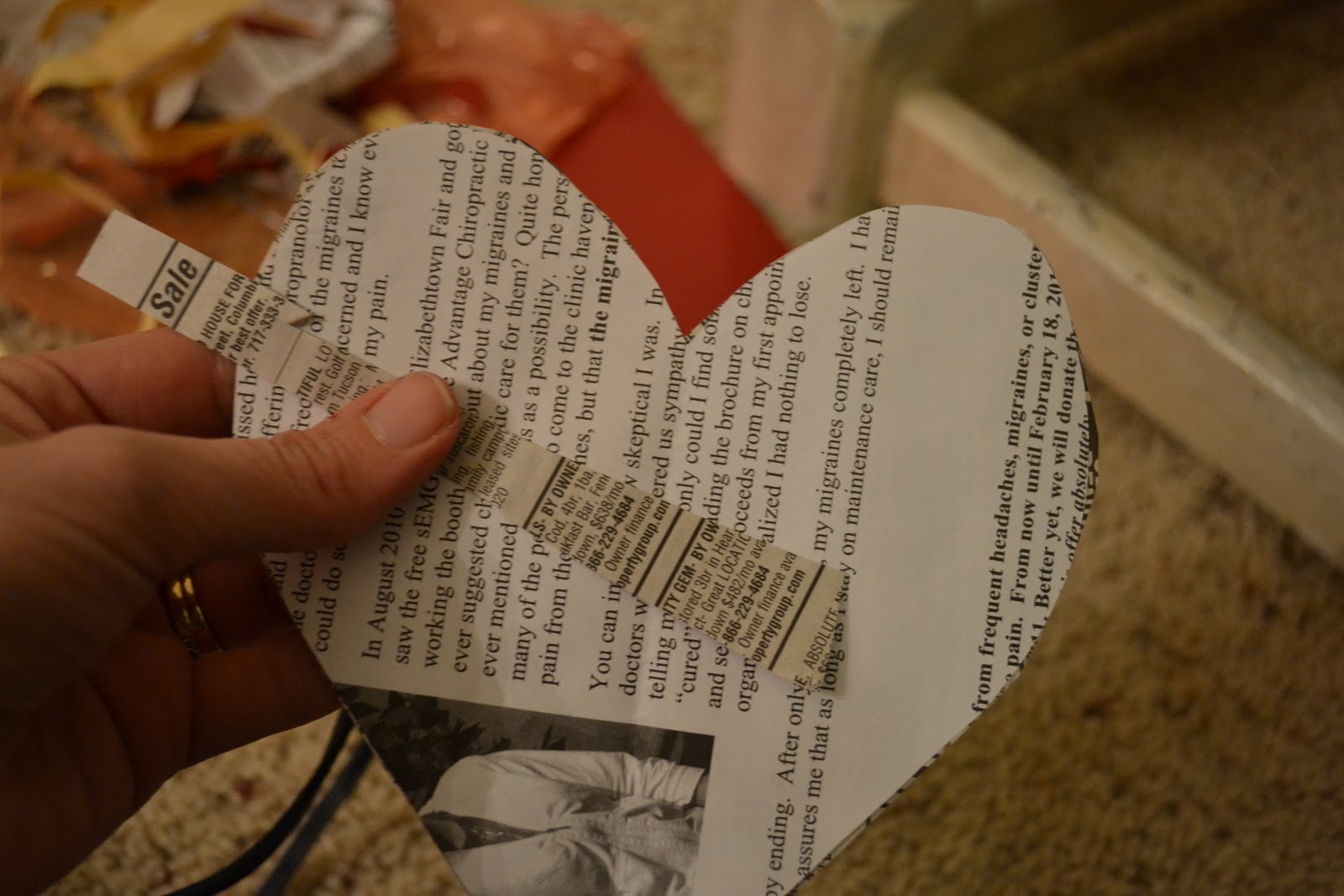 Первый вариант панно - газетное сердце со спиральными розами