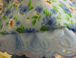 Можно, конечно обшить кружевом всю нижнюю юбку, но тогда на нее уйдет метров 6-7. У меня ушло всего 2. Прикидываю кружевной передничек к юбке. Любуюсь.