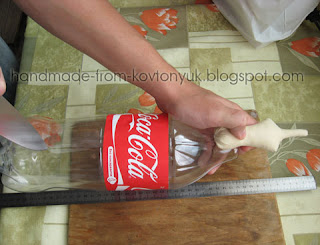 Итак, половина тела у нас готова. Теперь речь пойдет о подставке, точнее о юбке-каркасе. Придумала сама, реализовать помогал муж. Берем 2хлитровую бутылку от Кока-Колы (может и от Пепси подойдет, не знаю, я пью только Колу и очень редко… кстати, веселый факт, многим людям этот напиток помогает при переедании, так как содержит ортофосфорную кислоту).