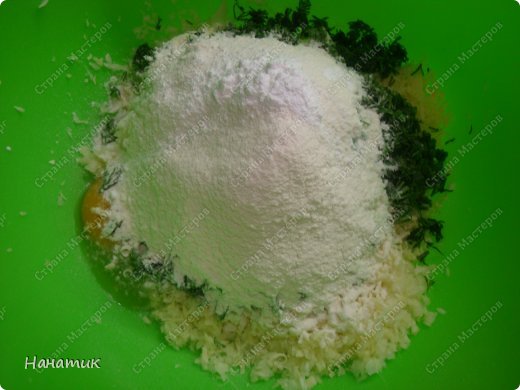 К капусте добавляем яйца, сметану, тертый сыр (на мелкой терке), резанный укроп, соль, муку и разрыхлитель.
