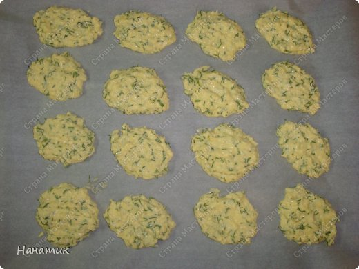 Противень застилаю бумагой для выпечки и ложкой столовой выкладываю на нее оладушки.