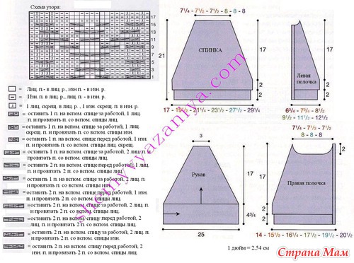 Примечание: Планка с узором для рукава вяжется поперек, затем петли поднять вдоль боковой стороны планки.