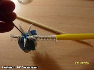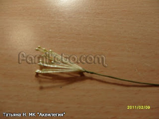 Приклеиваем получившиеся кувшинчики к обмотанной части заготовки тычинок. И вешаем сушиться.