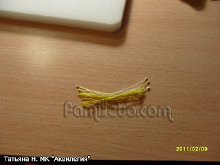 Взять тычинки с мелкими желтыми кончиками, можно взять в перемешку с желтыми желированными нитками. Проволочкой "обхватить" серединку, скрутить её и затем согнуть тычинки.