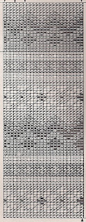 Данный ажурный узор можно связать на любой вязальной машине, выполняя ручную деккеровку одноушковым деккером по схеме, или на п/карточной машине, подготовив соответствующую перфокарту, или на электронной машине, подобрав любой другой подходящий узор.