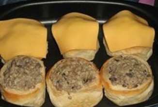 4. Смешать вместе обжаренный фарш и сливочно-грибную массу. Получившейся смесью начинить булочки и выложить в форму. Накрыть булочки сыром для сендвичей.