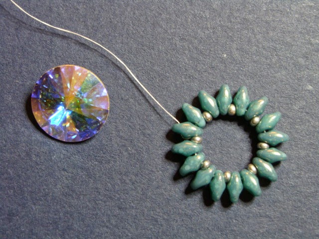 Раунд 1 : Для 14мм Риволи, строки узор 2 Superduos и один размер 11 бисера восемь раз. Образуют круг, пройдя через все бусины еще раз. Свяжите двойной узел, а затем использовать другой иглу, чтобы соткать хвост нити между бисером прежде, чем сократить затихать. С рабочей нитью, с выходом через наружное отверстие 1 Superduo.