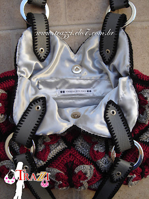 Материалы: 100 г серебристой хлопчатобумажной пряжи, крючок № 2, отрезок серебристой подкладочной ткани 44 × 26 см, 1 пуговица под обтяжку, цепочка серебряного цвета.