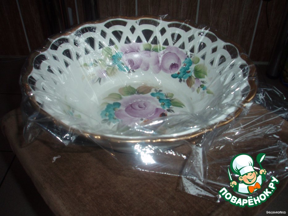 Форму выстелить пищевой плёнкой. В неё ,сначала, выложить сметану с желатином . Затем выкладывать слоями всего по чуть-чуть, перемазывая каждый слой сметаной.