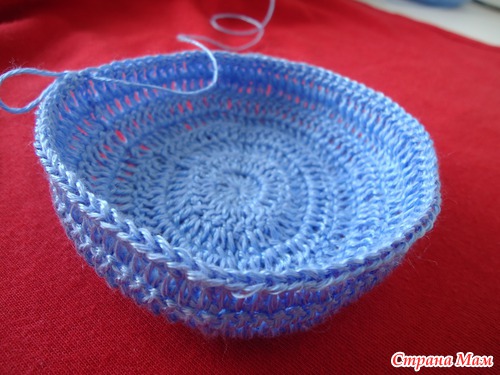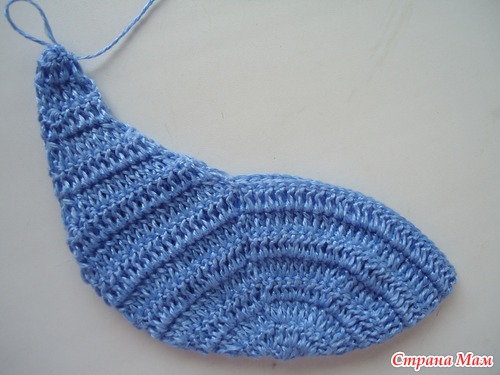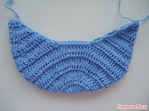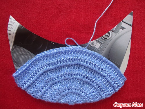 Связала сначала боковинки голубыми нитками, прикладывала к образцу и вязала