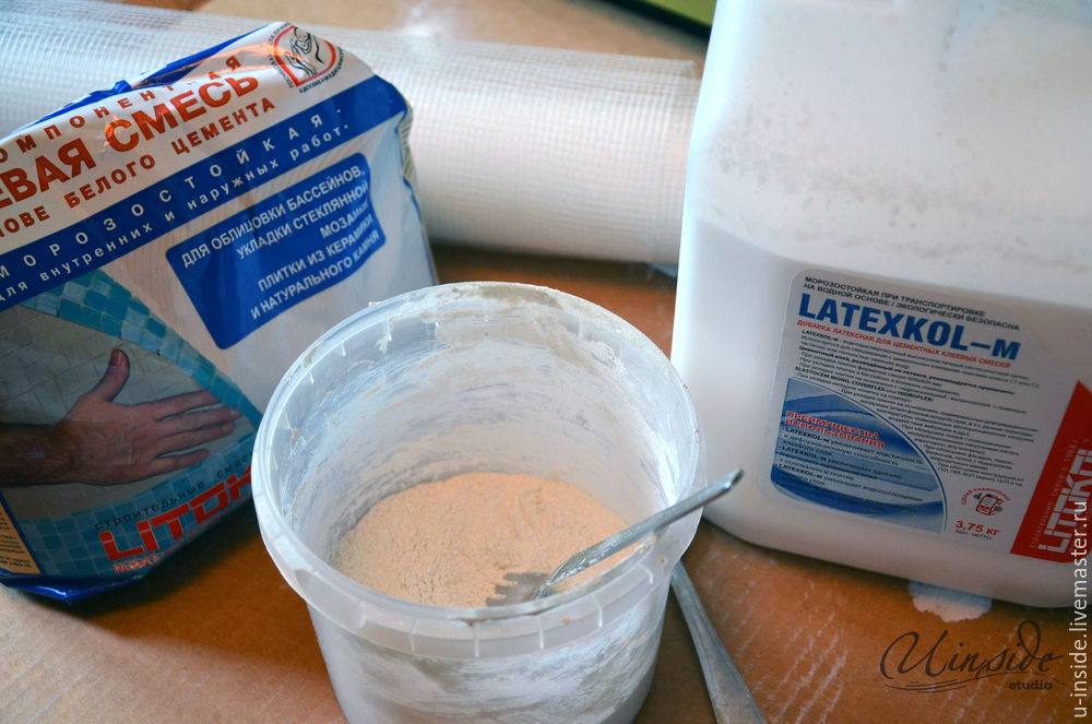 Как развести клей читаем на упаковке. Я делаю это на глазок до консистенции густой сметаны, добавляя клей ПВА (совсем немного) или же специальный пластификатор для эластичности. Удобно насыпать сухой клей в небольшое количество воды, так он быстрее и равномернее перемешивается. Главное, не переборщить с водой, но это приходит с опытом.