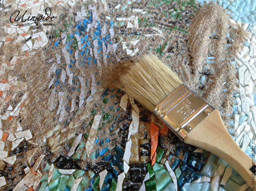 Проверяем всё ли ровно, не потерялись ли кусочки и заполняем пространство между ними мелким песком при помощи кисти, начиная от центра. Песок не должен остаться сверху, а лишь заполнить промежутки.