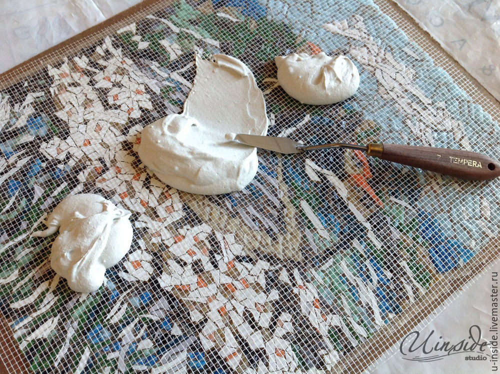 К этому времени необходимо подготовить основу из фанеры: зашкурить и загрунтовать (можно ПВА или же специальной грунтовкой), чтобы материал не впитывал лишнюю влагу из цементного клея, а также нанести тонкий слой клея, как бы втирая его мастихином в поверхность. Затем аккуратно соединяем обе части вместе, следя, чтобы фанера-основа легла на клеевую "подушку" ровно, без перекосов, чтобы совпали уголки. Ни к коем случае нельзя давить на получившийся "сэндвич".