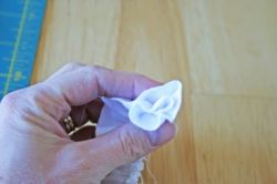 7. Закрепите основание цветка с помощью иголки с ниткой. Продолжайте оборачивать полоску вокруг бутона пока не получиться цветок. Не забывайте каждый оборот закреплять иголкой с ниткой.