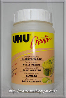 - Нанесите грунтовочный слой клея-лака UHU после того, как Вы вырезали мотив и удалили верхний из 3х слоёв салфетки.