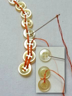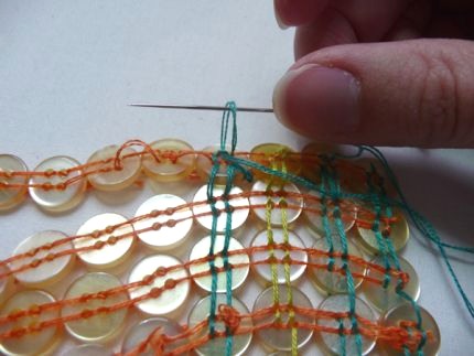 Берем иголку с ниткой и начинаем продевать в дурочки пуговиц,