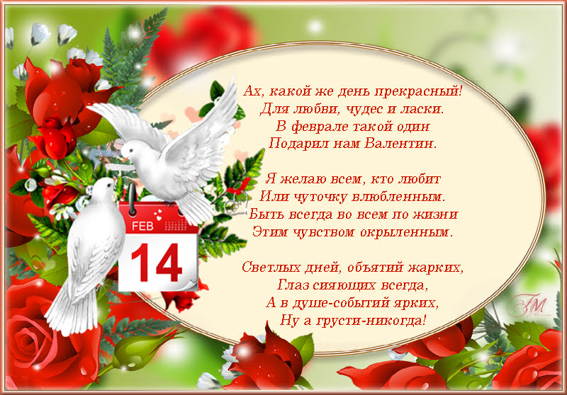 ![]() С Днем влюбленных поздравляю. Чувств вам искренних желаю, самых светлых и красивых, Глаз сияющих, счастливых, берегите чувства ваши. Станут пусть они лишь краше, слаще, чище и теплее. Станут пусть сердца роднее, вы друг другом наслаждайтесь, Верьте в чудо, улыбайтесь, смейтесь, искренне любите И друг друга берегите! |