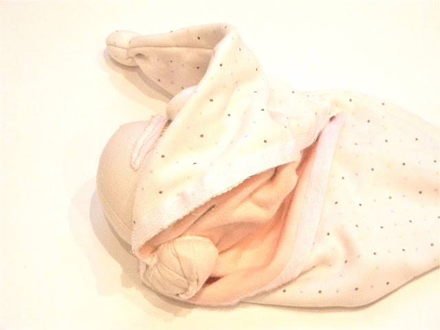 Далее берем "кожу" куколки - у нас это трикотажный рукав Ульяниной кофты нежно-розового цвета. Выворачиваем рукав наизнанку, зашиваем верхний край.