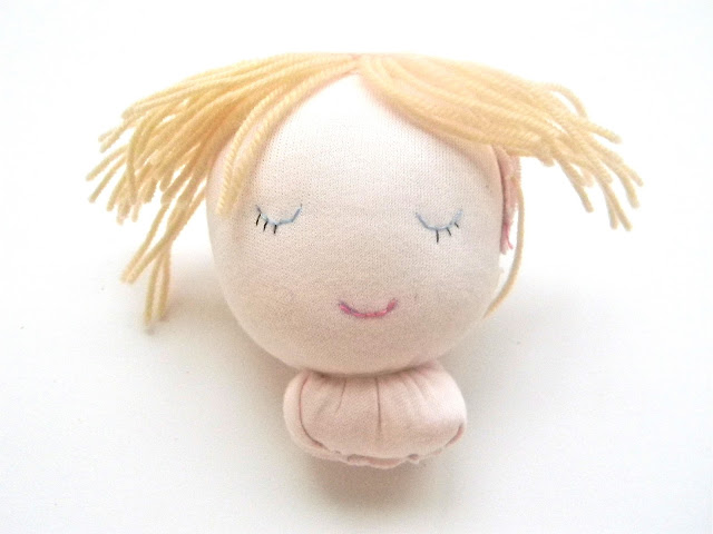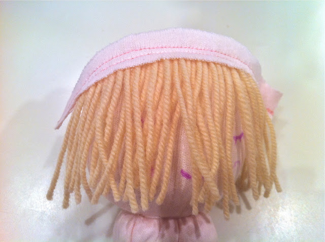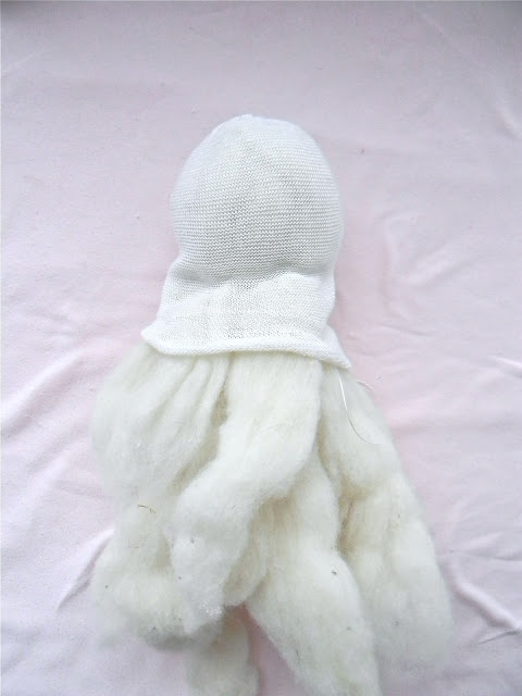 Прикладываем волосы к лицу куклы, отрезаем лишний трикотаж, намечаем, к какому месту головы будем пришивать "паричок" (он должен быть незаметен под колпачком). Волосы пока не подрезаем