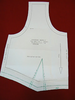 По линии плеча от шеи отложила 5 см (как показывает практика, это оптимальное расстояние - и лямки лифчика не вылазят, и довольно открытая горловина получается).Получили точку В. Соединяю ее с линией центра переда прямой линией под прямым углом к центру переда.Получили точку А. Зеркально переношу кусочек верха получившейся выкройки (примерно 12см) от линии АВ вверх.Это будет цельнокроенная обтачка качелек. По линии АВ после выкраивания переда её надо отогнуть на изнанку(на маленьком рисуночке внизу листа - заштрихованная часть).