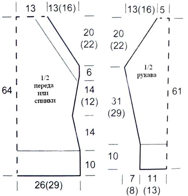 Продолжить изнаночной гладью, при этом для скоса рукава с обеих сторон прибавить в каждом 6-м р. 7 (11) раз по 1 п., в каждом 4-м р. 3 (0) раз по 1 п. = 50 (58) п.
