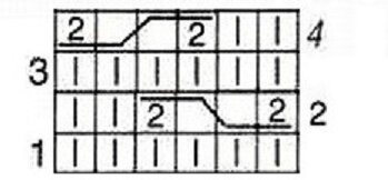 2-й ряд: * 1 лиц. п., ввести спицу на 1 ряд ниже и провязать 1 лиц. п., 1 лиц. п. *, повторять от * до *;