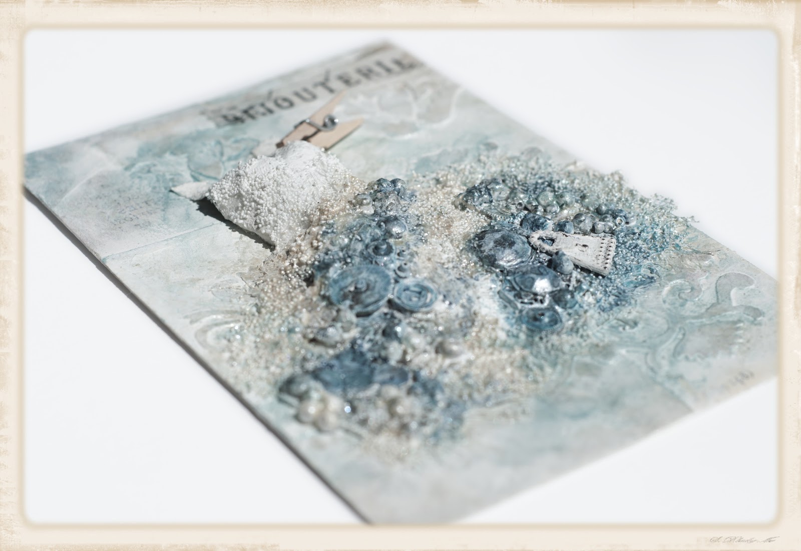 Описание к работе немногословное: я так поняла, что объем платью создан с помощью папье-маше, покрытого марлей и кружевом. Сверху аксессуары, бусины, объемный гель и тонирование краской. Но красиво очень!