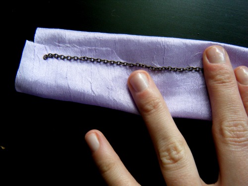 Посмотрите, какой эффект получается, если к полоске ткани добавить цепочку и потом свернуть цветочную розетку. Отличный вариант для создания украшений.