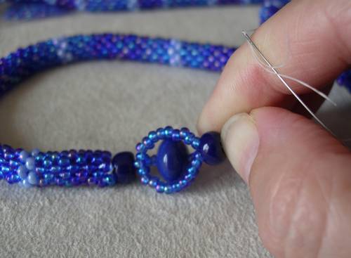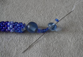 на другом конце жгута (где заканчивали вязание) последний ряд провязывается без бисера, нитка тоже вдевается в иголку с большим ушком и прячется в жгуте