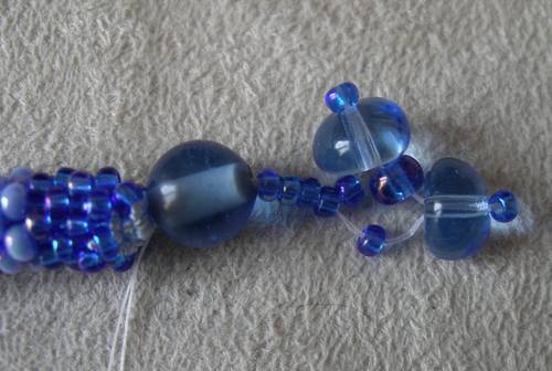 набираем среднюю бусину (меньше по размеру, чем крайняя крупная), опять крупную, мелкую для разворота, прошиваем обратно в крупную бусину, набираем одну бисерину и возвращаемся в бисерины (кроме одной последней в столбике) и торцевую бусину к краю жгута