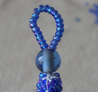 теперь натягиваем хорошенько нитку и примеряем нашу петлю к бусине на ножке или к букве "т" на другом конце жгута, петля должна одеваться очень плотно, если петля слишком свободная, сбрасываем бисерину или две и опять примеряем
