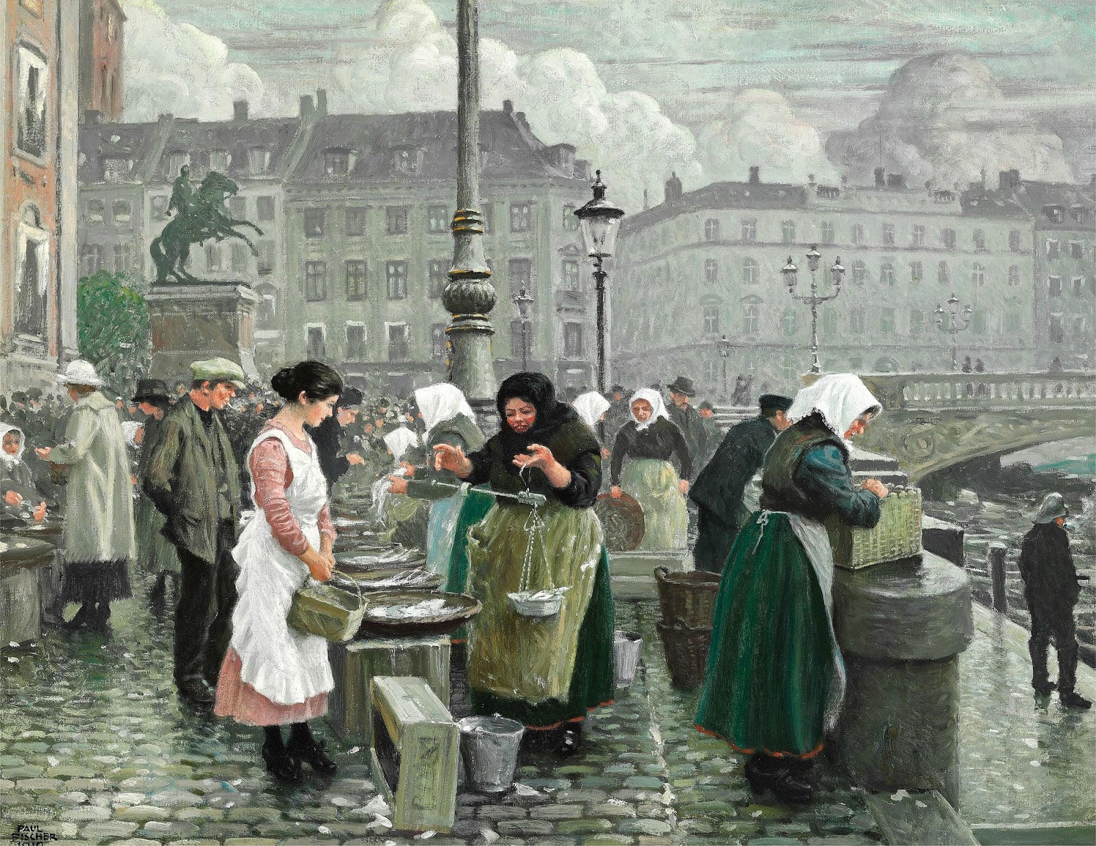 Молодая служанка покупает рыбу на рынке на Gammel Strand, Копенгаген.1919