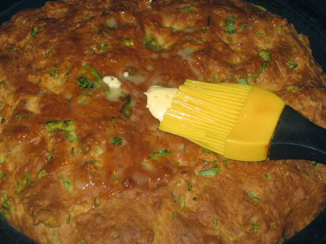 Достаём тесто и выкладываем его в смазанную растительным маслом форму для выпечки или в любую сковородку. Выпекаем 30 минут при температуре 200 градусов.