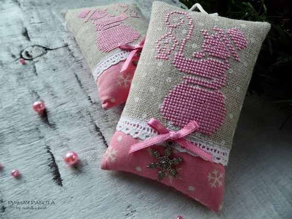 Немецкий хлопок, лён «Белфаст», хлопковое кружево, атласная лента, металлический шармик, мулине «Гамма», синтепух. Размер примерно 6*9 см.