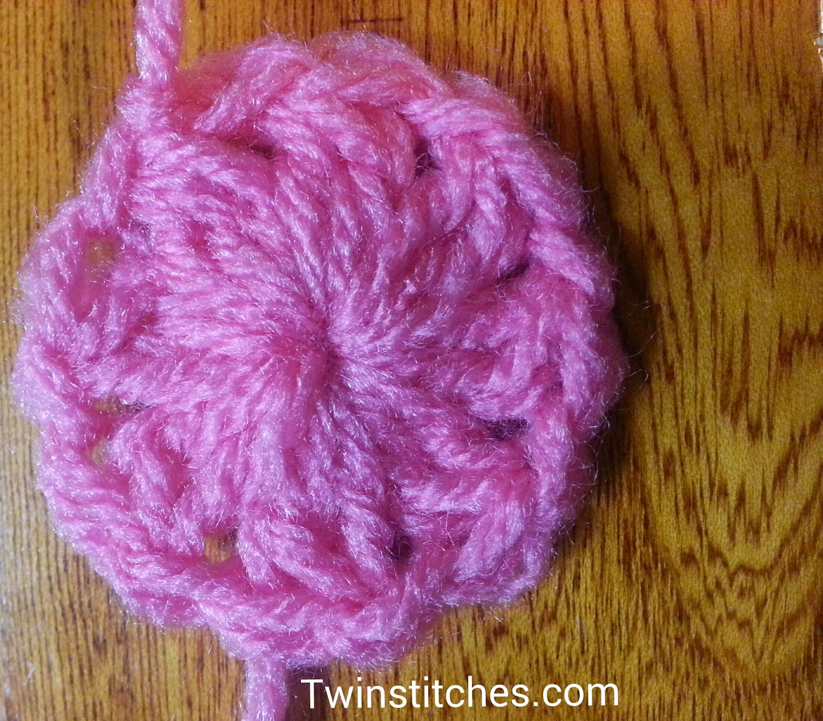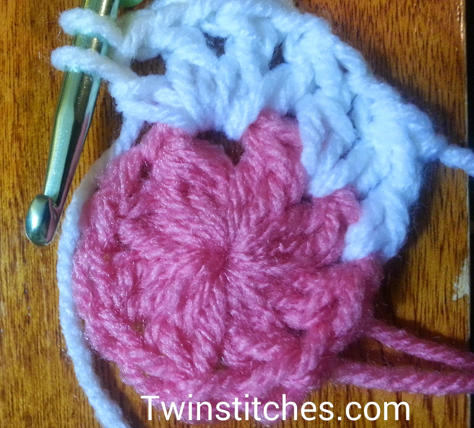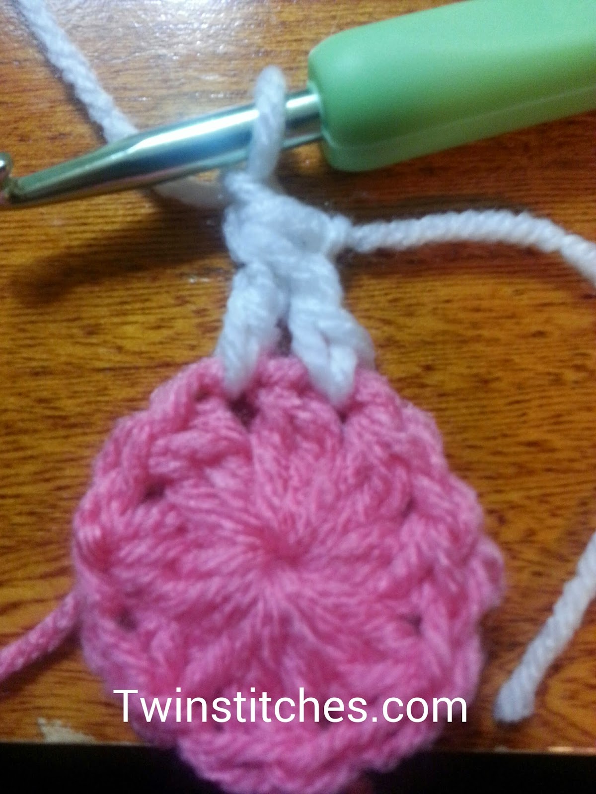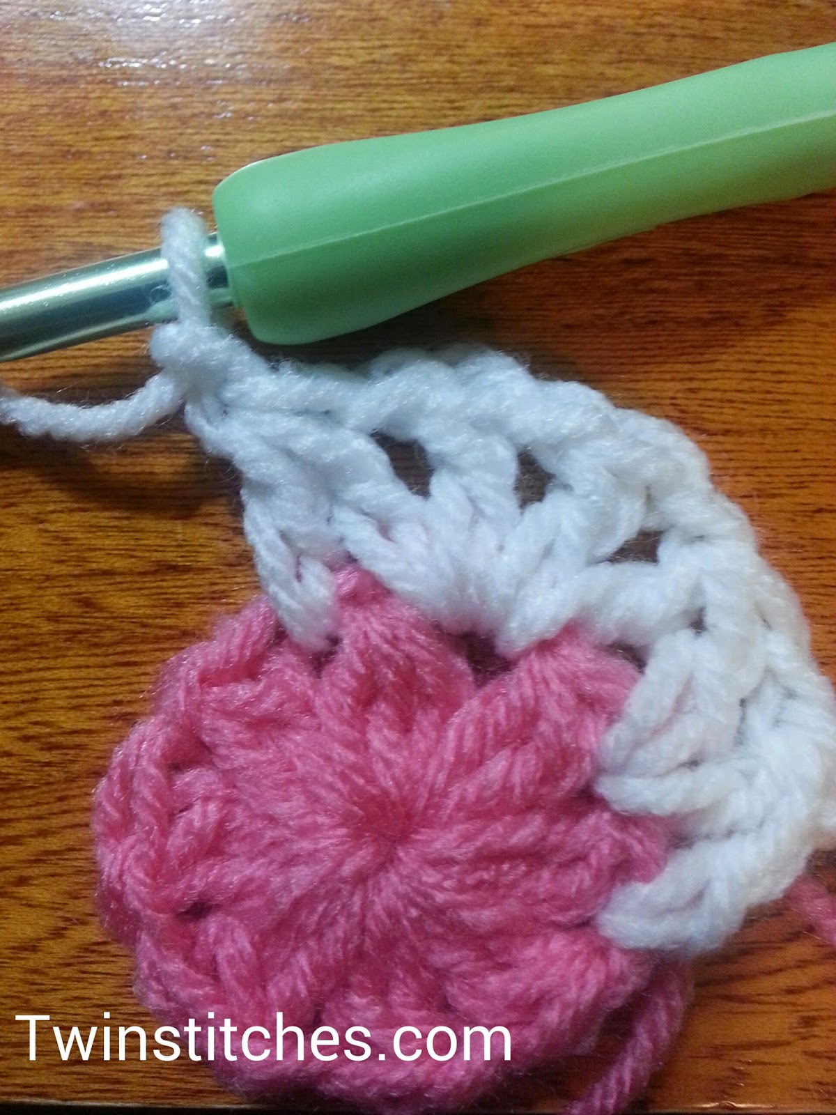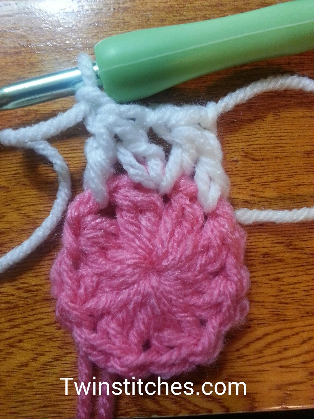 Row 1: Using Color 1, crochet a magic circle, chain 2 (does not count as a stitch). Crochet one dc2tog, then chain 1. Repeat from * to * seven more times. Join to the top of the first dc2tog. Fasten off. Close magic circle.