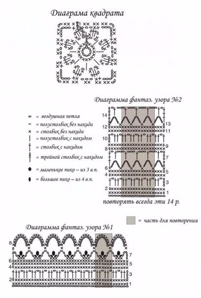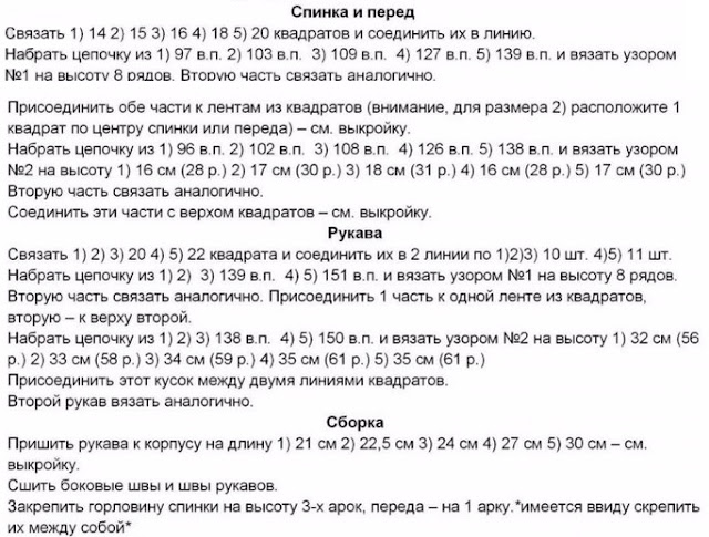Низ спинки, переда и рукавов пуловера, а также вырез горловины украшает ряд из квадратных мотивов. Края пуловера обвязаны кружевным фантазийным узором. "Бохо" стиль подразумевает использование природных, натуральных материалов, поэтому пуловер связана из хлопковой пряжи.