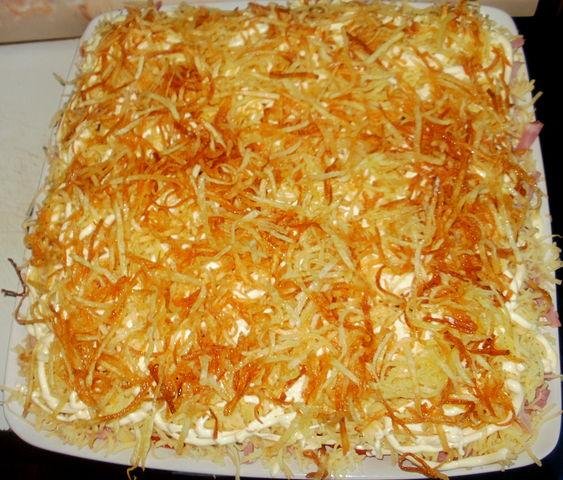 Этот салат очень сытный, эффектный и простой в исполнении. Подойдет не только блондинкам, даже скорее не блондинкам, потому что очень калорийный.