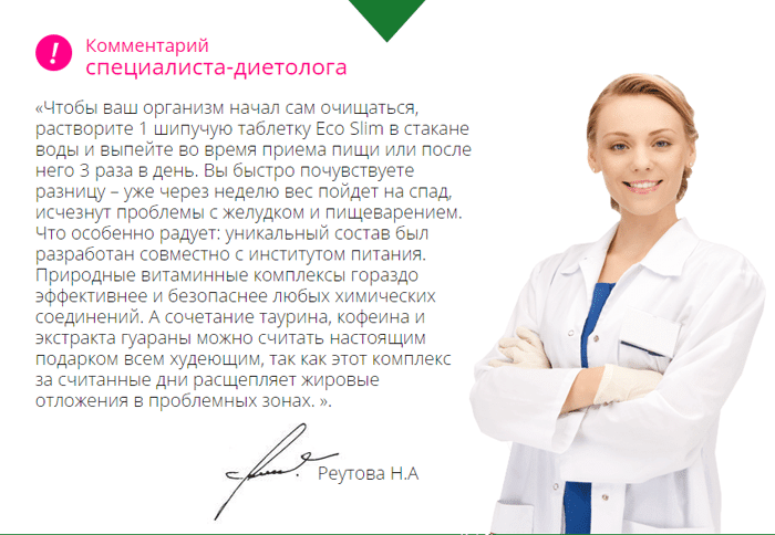 Eco Slim для похудения понравился всем, кто пользовался им в домашних условиях. И не только простые женщины, даже врачи отзывами охотно делятся в различных интервью и на форумах. Главные особенности действия шипучих таблеток «Эко Слим»: